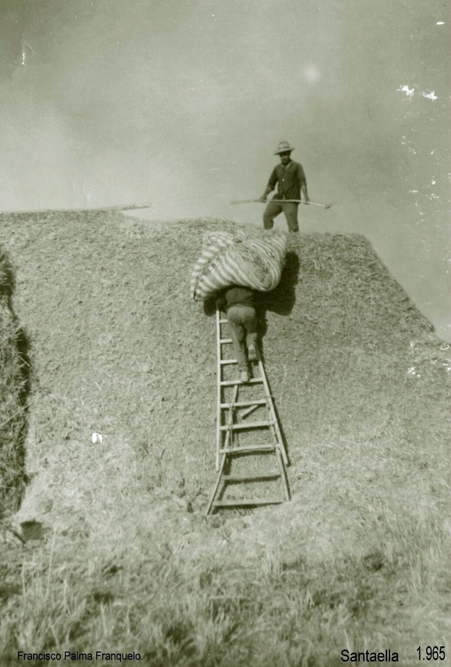 Portandola en la cabeza, se subia a lo alto del almiar subiendo unas escaleras.